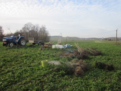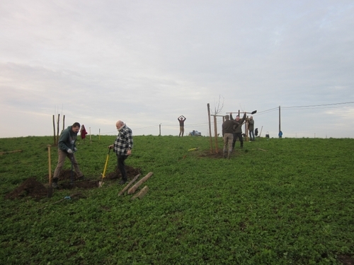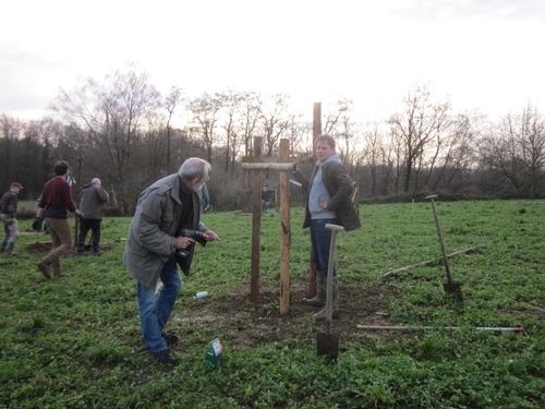 Pari réussi. Grace à l’aide et à l’application de chaque personne présente samedi et dimanche, 3 lignes de haie vive et nourricière sont plantées. Les arbres fruitiers sont déjà tous debouts comme des promesses bien engagées de jus de bonne terre et de générosité. Enthousiasme. On parle de semer une première sole de courges au printemps…